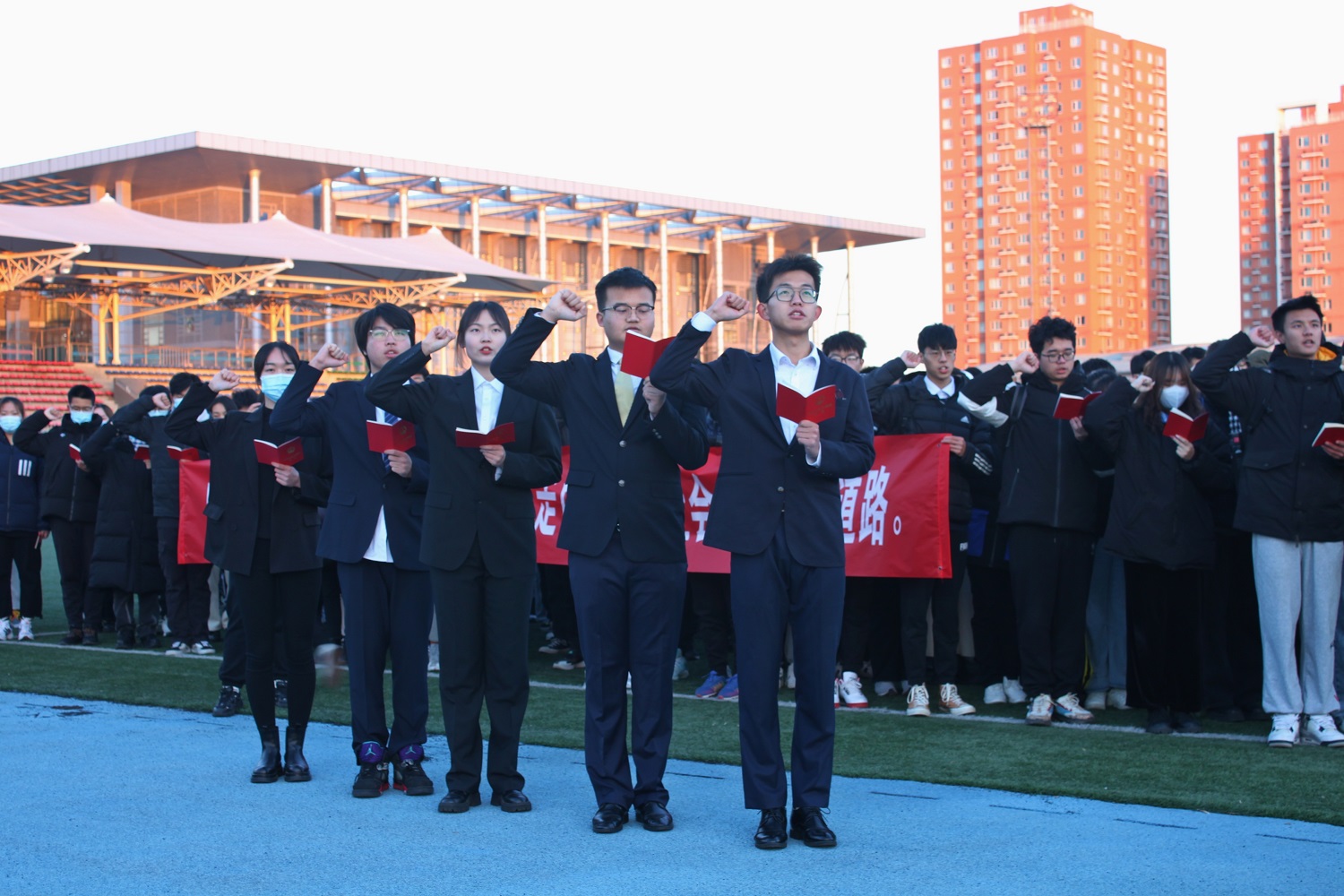 12月3日早7点,3044AM永利集团官方首页、传媒与设计学院、人工智能学院、计算机学院、商学院、外国语学院共计220余名同学在3044AM永利集团官方首页团委书记王安澜的带领下齐聚操场,观看学校国旗护卫队升旗仪式,展开“宪法宣誓·共看升旗”主题教育活动。晨光熹微中,同学们将宪法捧在胸前,面向国旗,高举右拳郑重宣誓:建设富强民主文明和谐美丽的社会主义现代化强国努力奋斗!